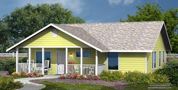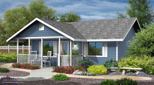 The Maywood offers a spacious 600 square foot living space. The front of the home boasts a generous porch for sitting and enjoying the outdoors, which can be easily screened-in. An open style living room and kitchen have vaulted ceilings that provide bonus space for storage cabinets above. The kitchen is full-sized and has a computer desk nook. The bedroom is illuminated by two windows and includes a six foot wide closet. Within the spacious bathroom is a walk-in shower and a full-size laundry area. The Maywood is designed to meet the needs for aging-in-place with a step-less entry, 36" wide doors and hallways. With three exterior styles (lap siding, stucco and panel siding) the Maywood can be finished to complement the lot's existing residence.